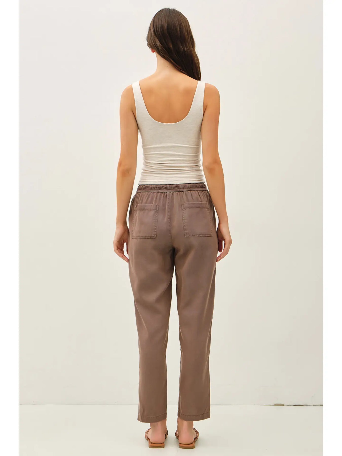 * tencel * tapered * pants * accent color on pocket ,drawstring *back pockets * drawstring waist * pull on * elastic waistband * relax fit * light weight * casual and comfort