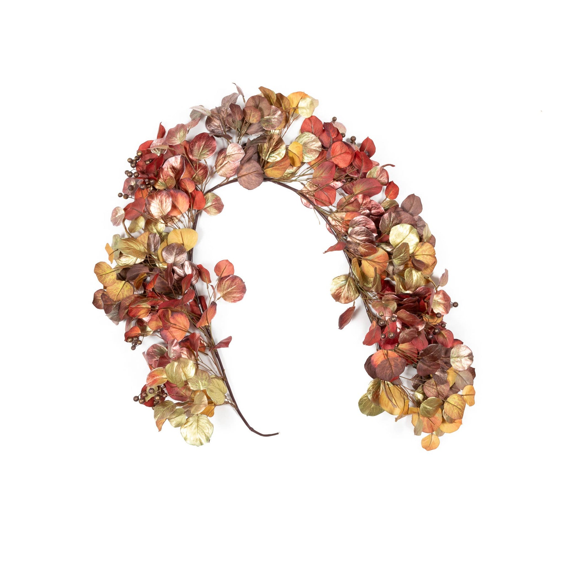 This 50-inch Ombre Leaf Garland showcases a striking blend of deep browns, fiery reds, and golds, giving a rich, dimensional look that’s perfect for fall or holiday decor. The ombre effect creates a beautiful transition of color, adding vibrancy and texture. With its bold tones and metallic sheen, this faux garland is ideal for creating a festive focal point along mantels, tabletops, or entryways. A versatile and elegant piece, it's designed to enhance seasonal decorations or special events with a sophisticated, artistic touch. • Dimensions: 50 inch length