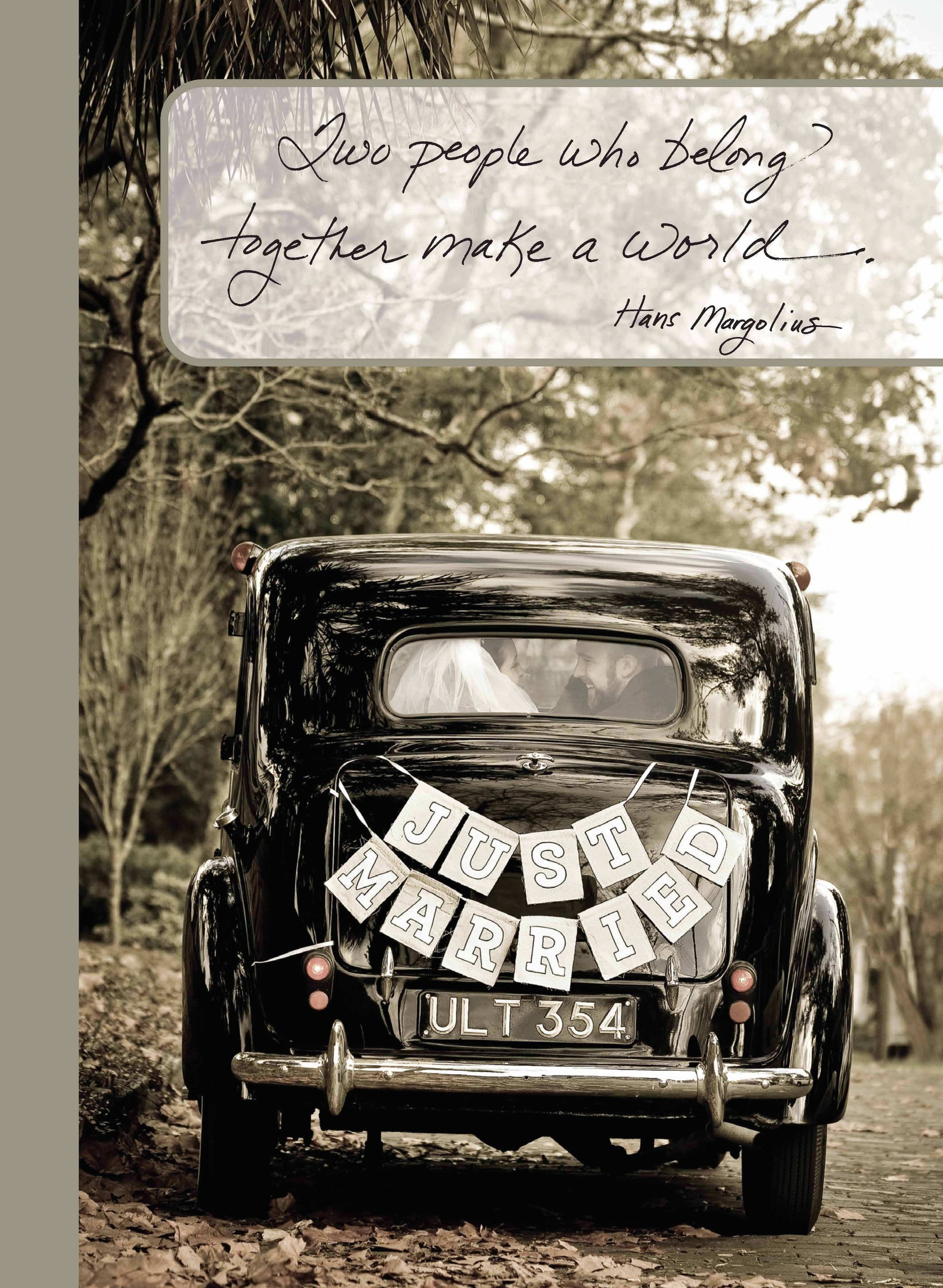 This wedding card captures that beautiful moment when two people start their journey together. The front features a touching quote about belonging together, paired with a nostalgic sepia photograph of a classic car driving down a tree lined road with a Just Married banner trailing behind. You can see the happy couple through the back window, and it feels like you're watching them drive off into their new life.