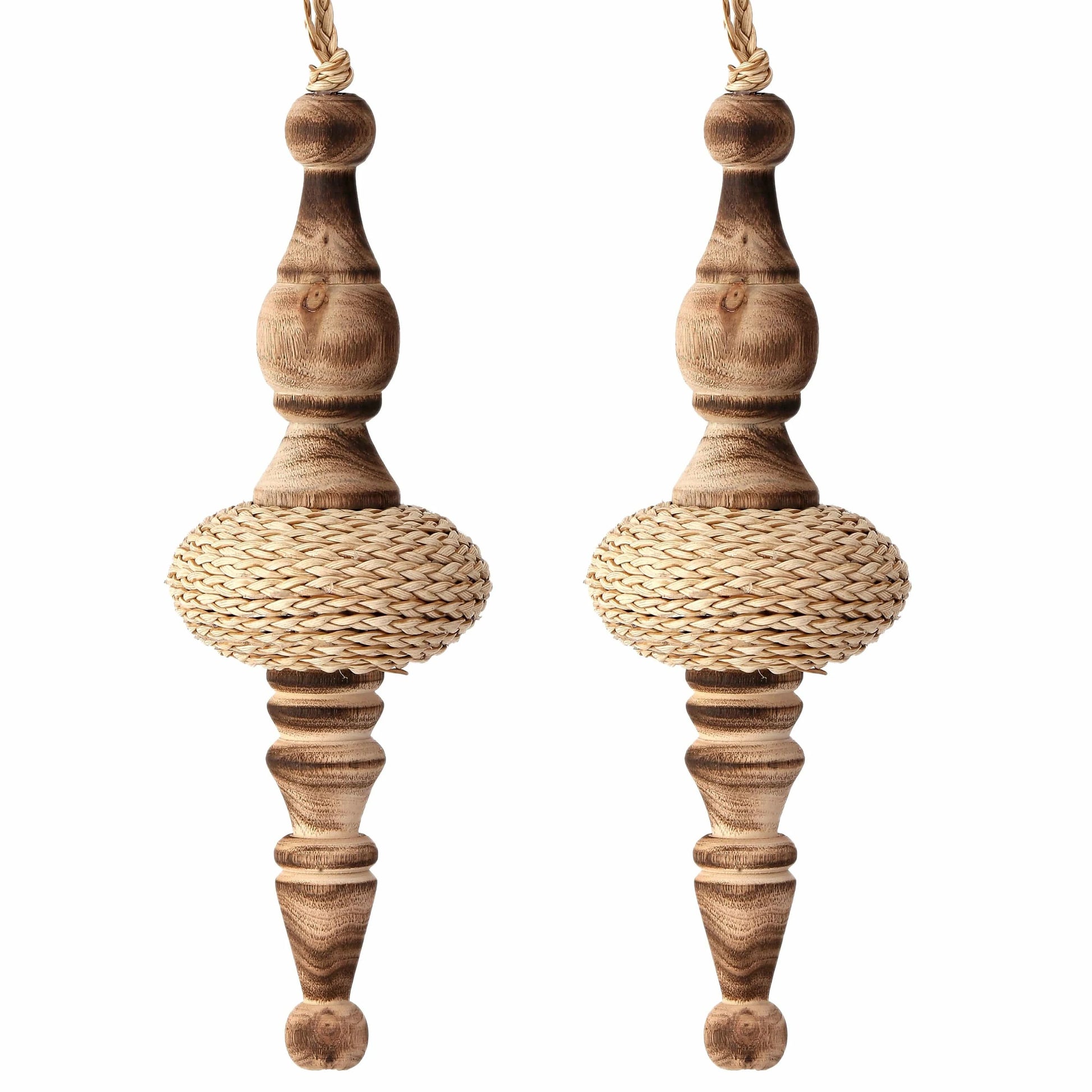 This wood finial ornament brings that lovely natural texture everyone loves right now. It has a classic finial shape carved from wood with a band of woven raffia wrapped around the middle, and there's a loop at the top so you can hang it wherever you need a little something special.
