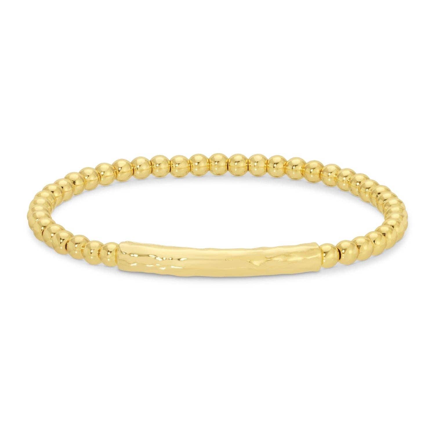 Add a touch of texture to your wrist stack with our beaded, 4mm stretch bracelet featuring a curved bar. The bracelet pairs well with our Pulley Tennis Bracelet. Stretch Bracelet (Approximately 6.5") 18k Gold or Rhodium Plated Brass Base