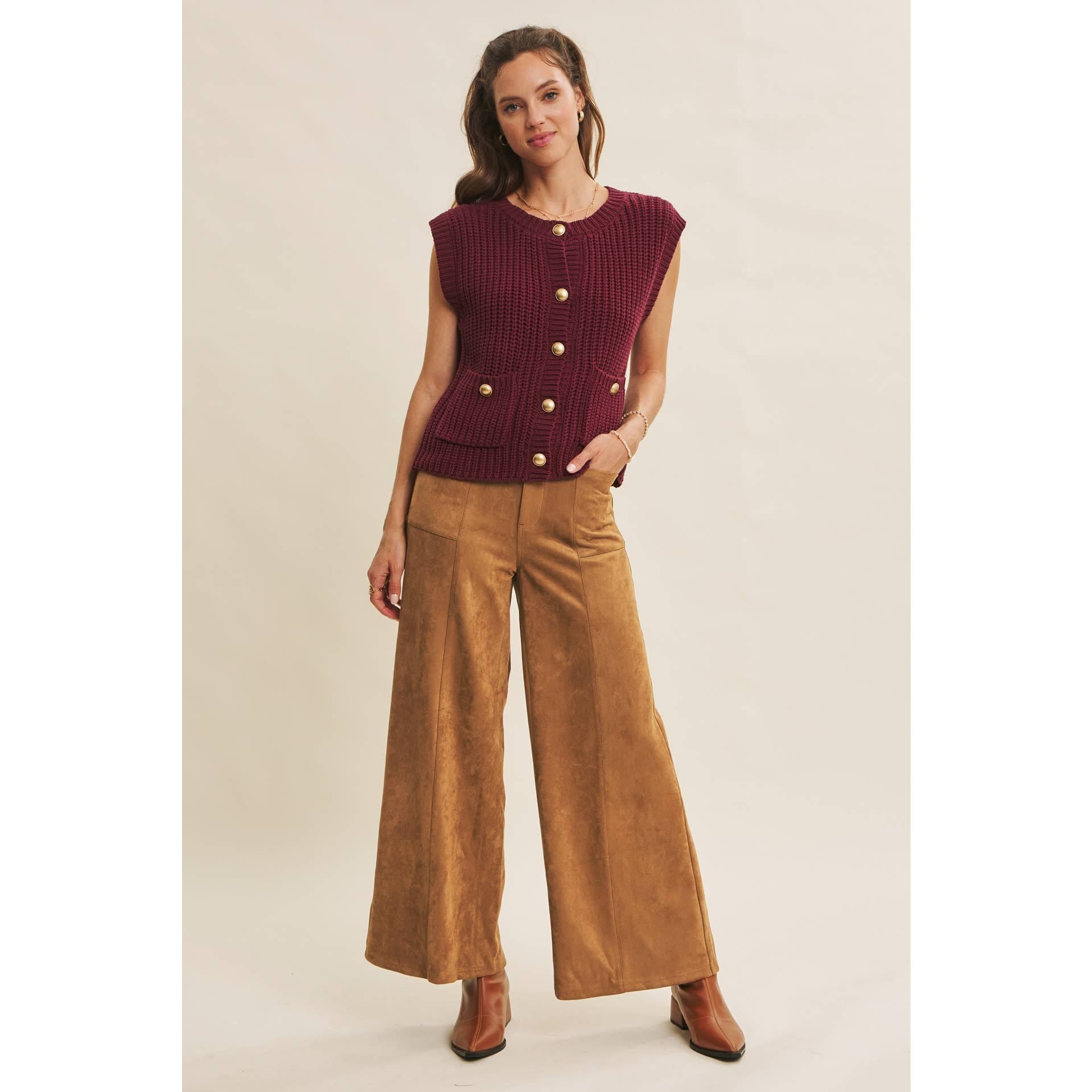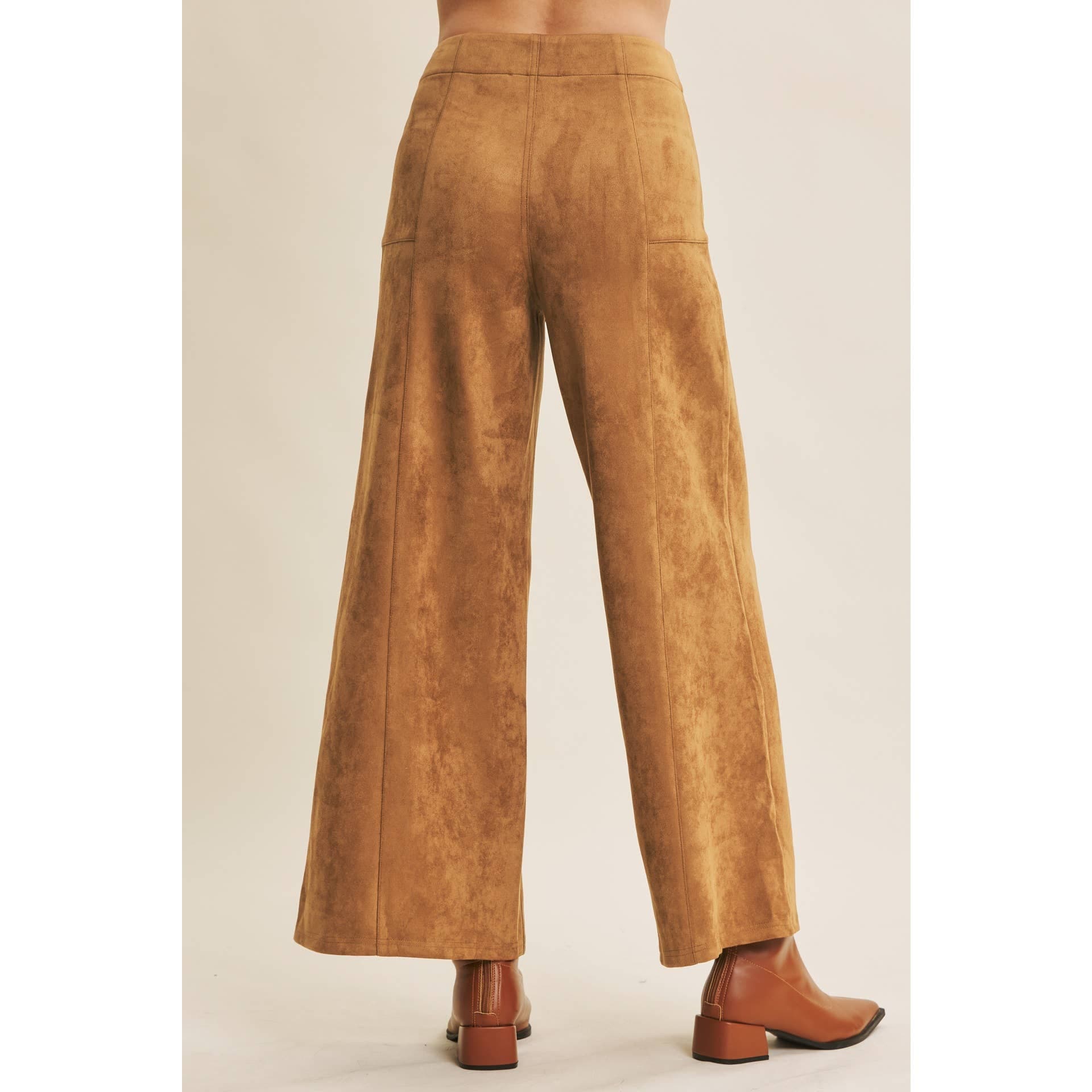 Elevate your FW lineup with these buttery-soft wide-leg pants in a warm camel hue that flatters every skin tone. Crafted from stretchy faux suede, they offer all-day comfort while delivering a polished, elevated silhouette. These pants strike the perfect balance between structure and ease—perfect for tucking in your favorite knits, cardigans, or layered tops. The wide-leg cut elongates the legs and adds subtle drama, while the plush suede texture makes them feel cozy and luxurious. Whether styled with boots and a sweater for a weekend outing or dressed up with a blouse for a casual office day, these pants offer unbeatable versatility. Features - Wide-leg pants - Stretchy suede fabric Size + Fit Model is 5'9.5" and wearing a size Small Please refer to our size chart.