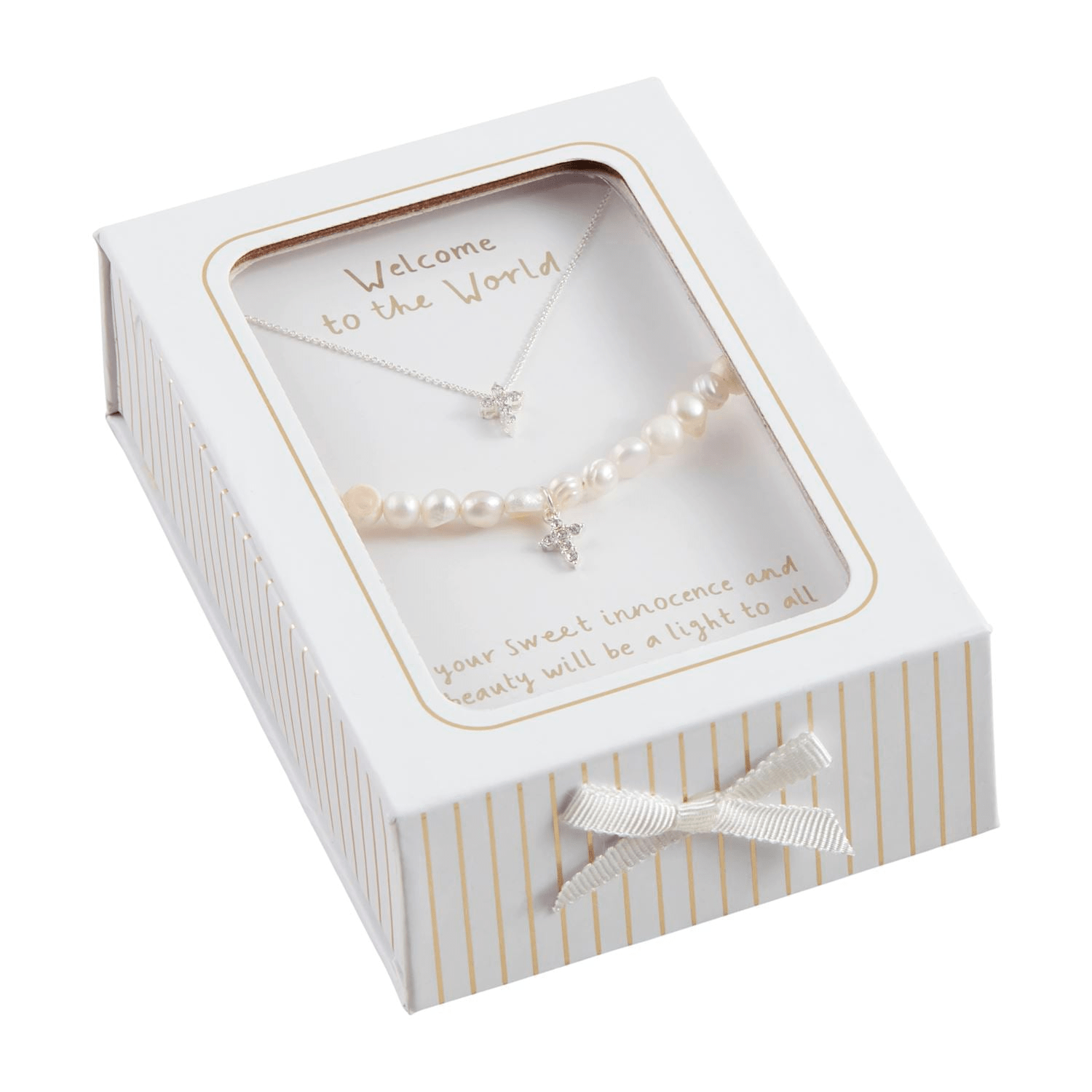 2-piece set. Boxed set features pearl bead bracelet with petite pave cross charm and coordinating pave cross necklace with delicate chain.