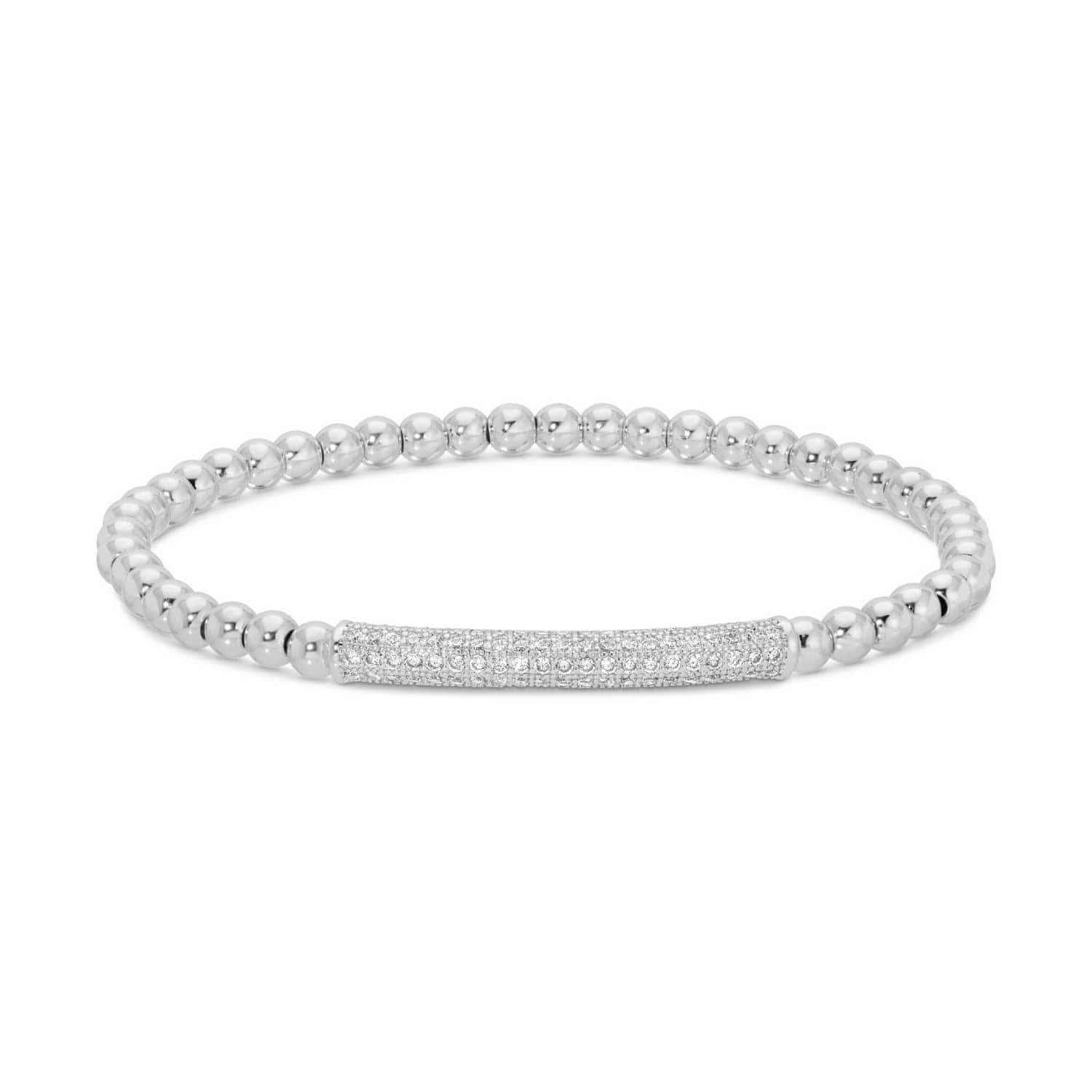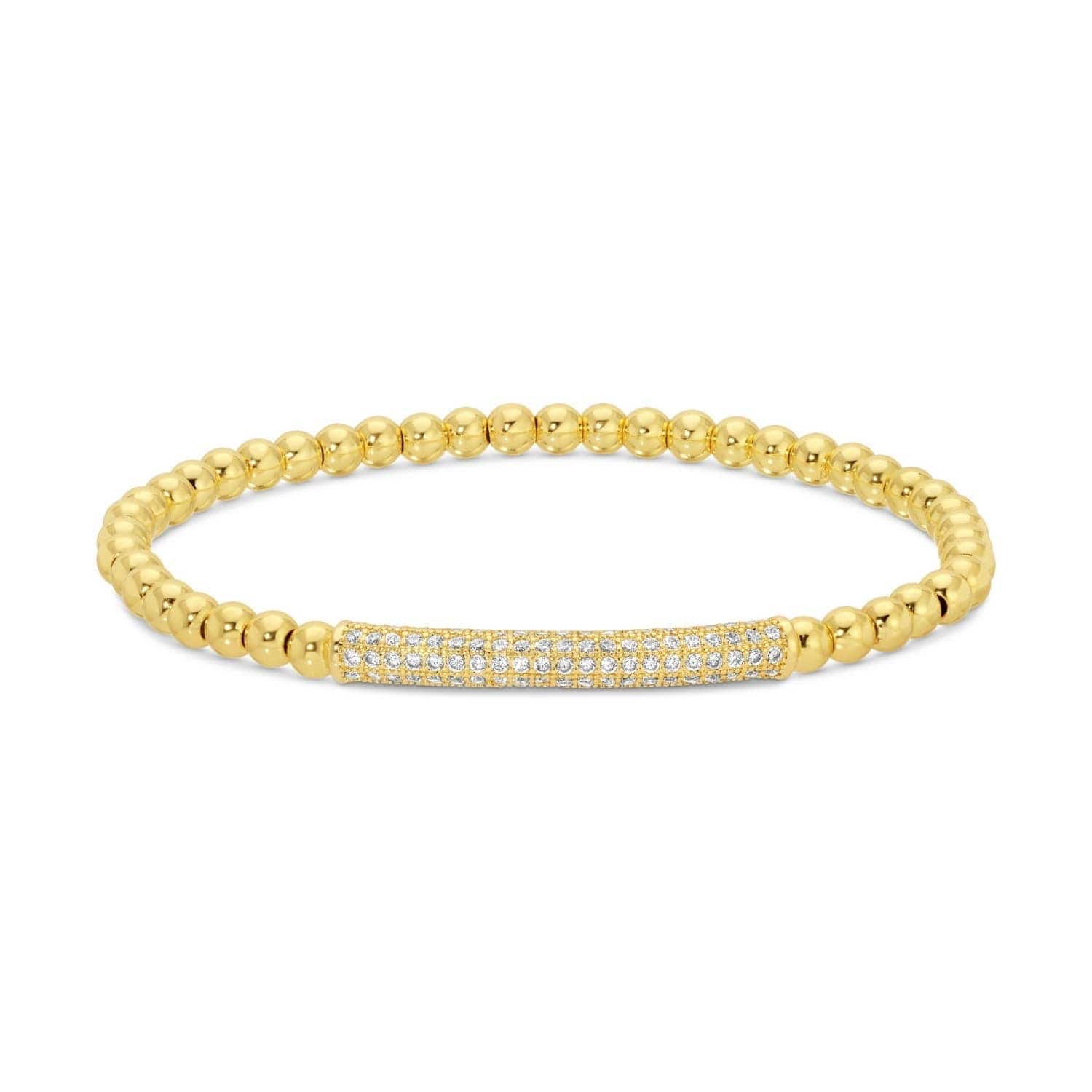 Add some sparkle to your wrist with this curved pave bar stretch bracelet! The 4mm beads and cz pave bar make quite the statement, especially when paired with a stack of plain beaded bracelets. Approximately 6.5" Stretch Bracelet 18k Gold or Rhodium Plated Brass Base Cubic Zirconia