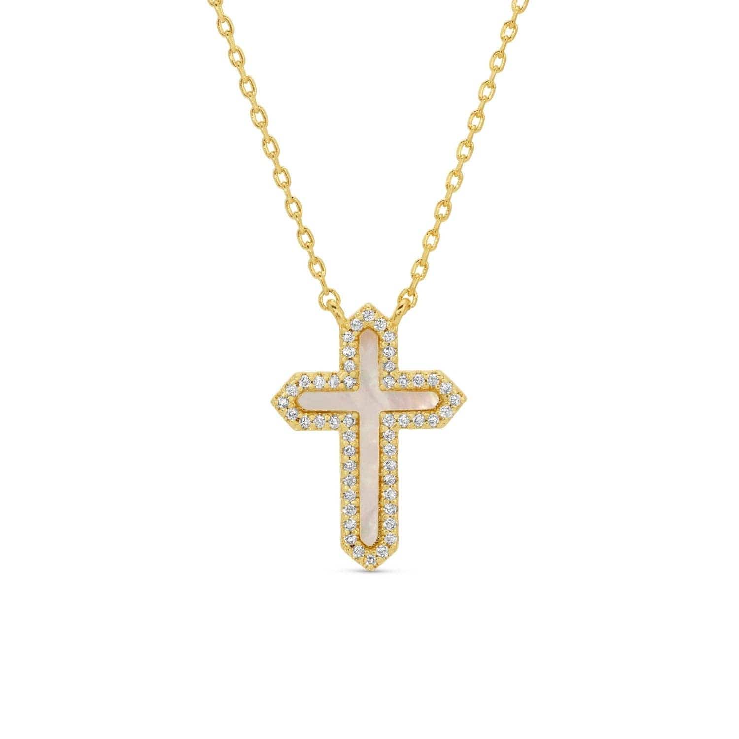 Embrace the power of faith with this Cross Necklace. This delicate and meaningful piece features a cross shell pendant framed with sparkling cubic zirconia. Designed to inspire, this necklace serves as a beautiful reminder of strength, hope, and belief. 16" Necklace .5" x .7" Pendant 18k Gold Plated Brass Base Shell Cubic Zirconia