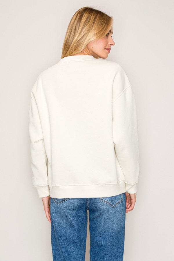 This ivory sweatshirt showcases an intricate allover bow embroidery pattern that elevates a timeless casual design with refined femininity. Constructed from a soft, midweight cotton-polyester blend with a smooth finish, it delivers warmth without bulk. The relaxed silhouette, crew neckline, and ribbed cuffs and hem create a balanced, understated aesthetic that transitions seamlessly from casual to polished. Perfect for layering or wearing solo, it pairs effortlessly with denim, skirts, or tailored trousers. An essential addition to fall and winter collections for retailers seeking pieces that combine comfort with contemporary appeal. 60% cotton, 40% polyester.