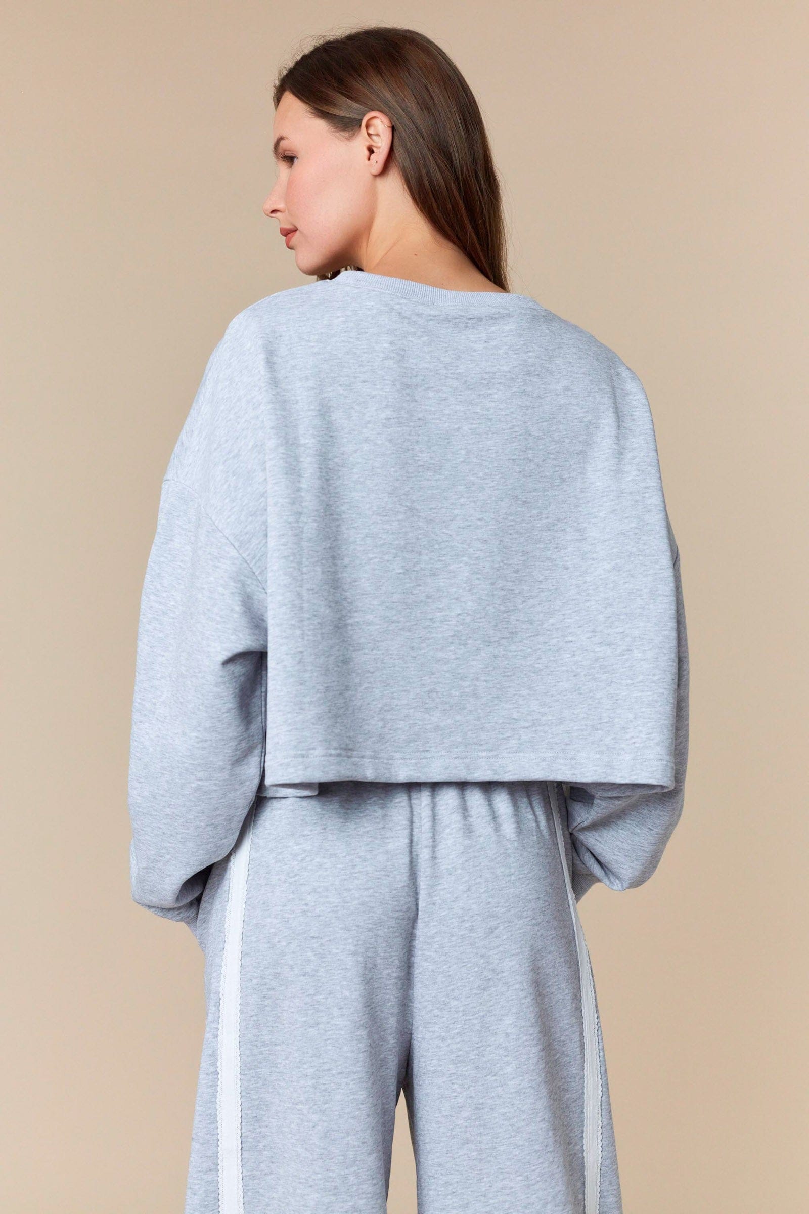 Crafted from a premium cotton-polyester blend, this two-piece set combines refined details with everyday comfort. The cropped sweatshirt features delicate lace trim and a charming spaghetti bow tie accent, while scalloped edges and grosgrain tape elevate the design. Paired with French terry track pants, this set delivers polished sophistication for casual wear that doesn't compromise on style.