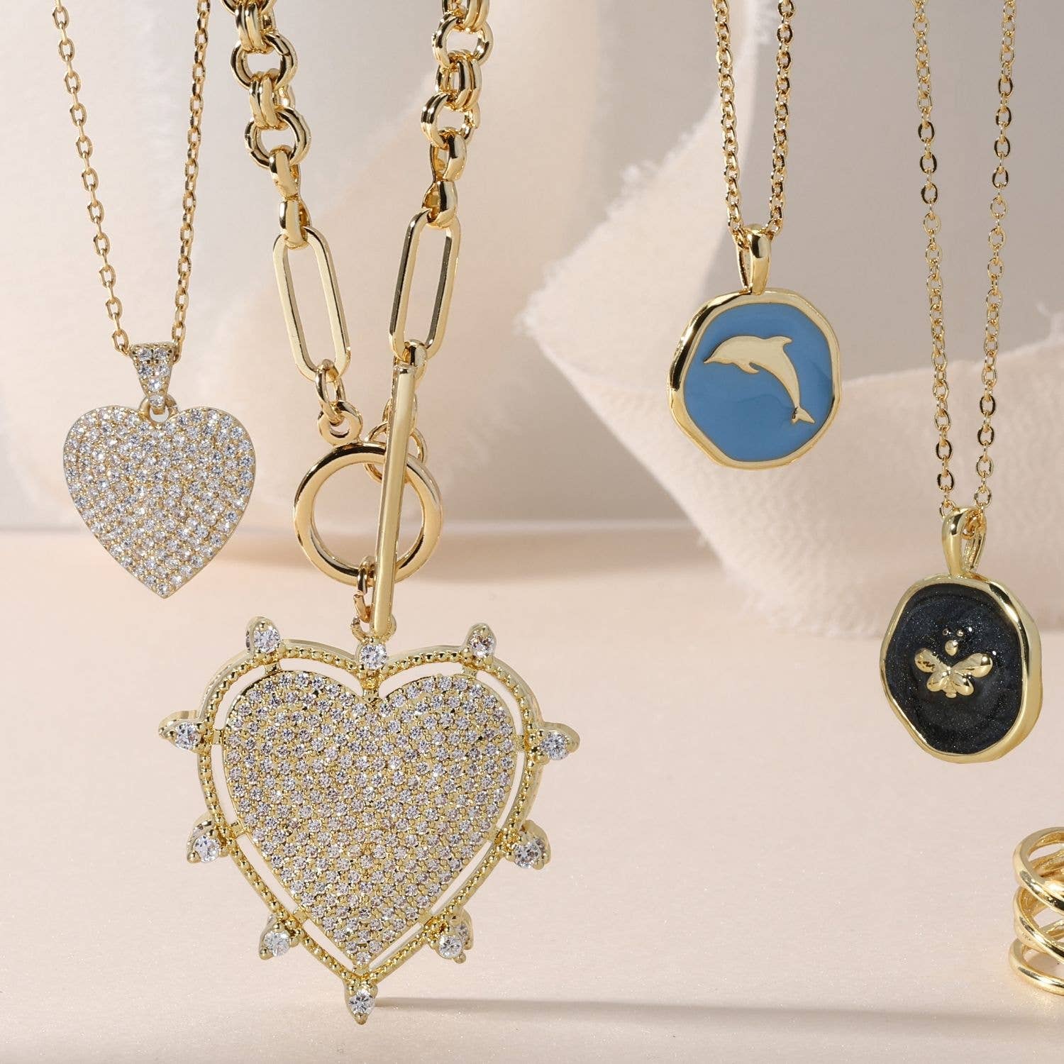 Make a statement with our stunning Large Pave Toggle Heart Necklace! This eye-catching piece features a bold, pave-set heart pendant, beautifully outlined with a sparkling CZ accented border. The pendant hangs elegantly from a long oval link chain, creating a modern and sophisticated look. Finishing this captivating design is a stylish toggle closure, adding a touch of unique charm and making it easy to wear. Whether you're dressing up for a special occasion or adding a touch of glam to your everyday style, this necklace is sure to turn heads. 18" Necklace 1.3" x 1.2" Pendant Toggle Closure 18k Gold Plated Brass Base Cubic Zirconia