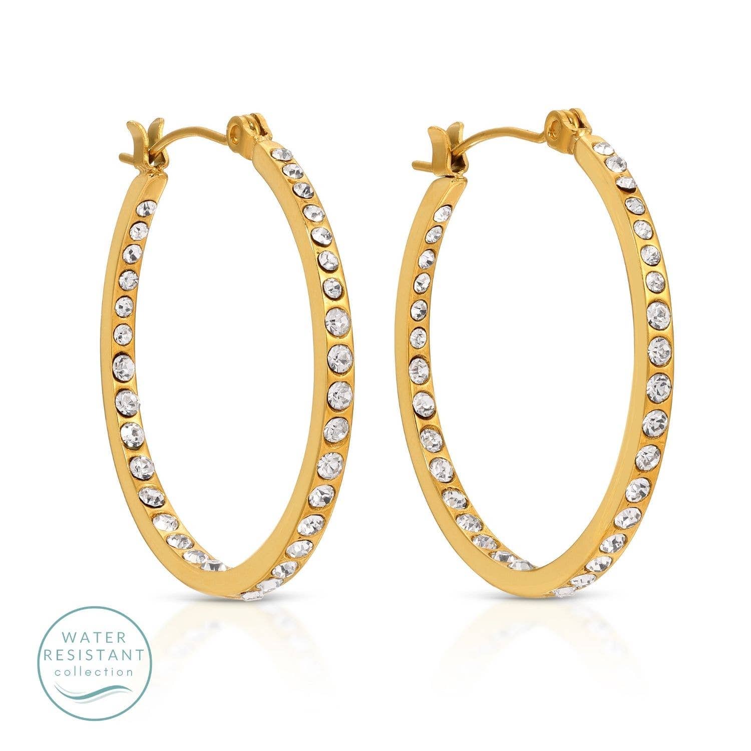 Elevate your everyday sparkle with our Latch Back Water Resistant CZ Hoops! These earrings offer the perfect blend of classic elegance and modern durability, designed to keep up with your active lifestyle without losing their luster. What truly sets these earrings apart is their water resistant quality. You can wear them confidently through daily showers, workouts, and unexpected splashes without worrying about tarnishing or discoloration. This makes them the ultimate choice for long-lasting, non-tarnish jewelry that you'll never want to take off! Water Resistant 1.3" Drop 18k Gold PVD Plated Stainless Steel PVD Plating offers a slightly darker gold tone Cubic Zirconia