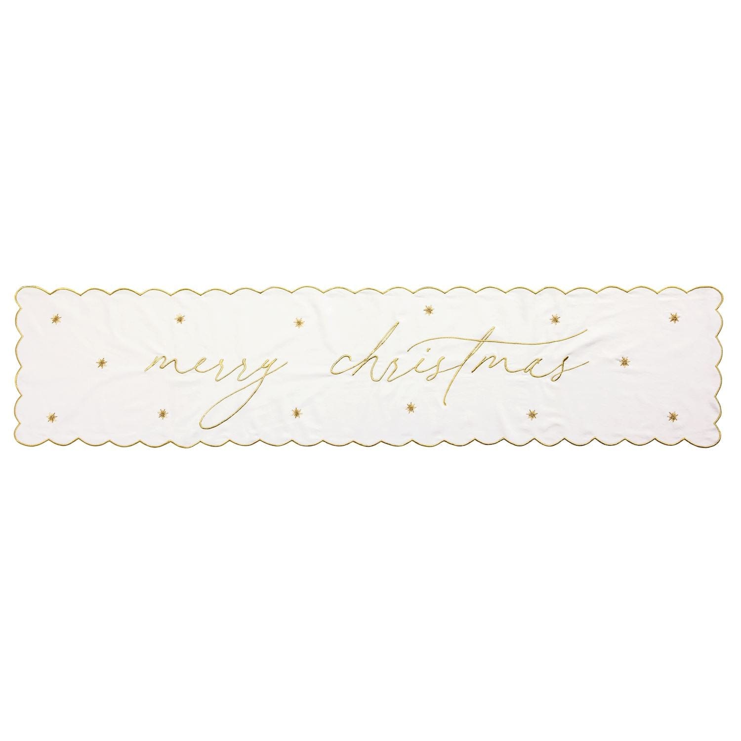Cotton table runner features gold lurex embroidery, bead and scallop detail.