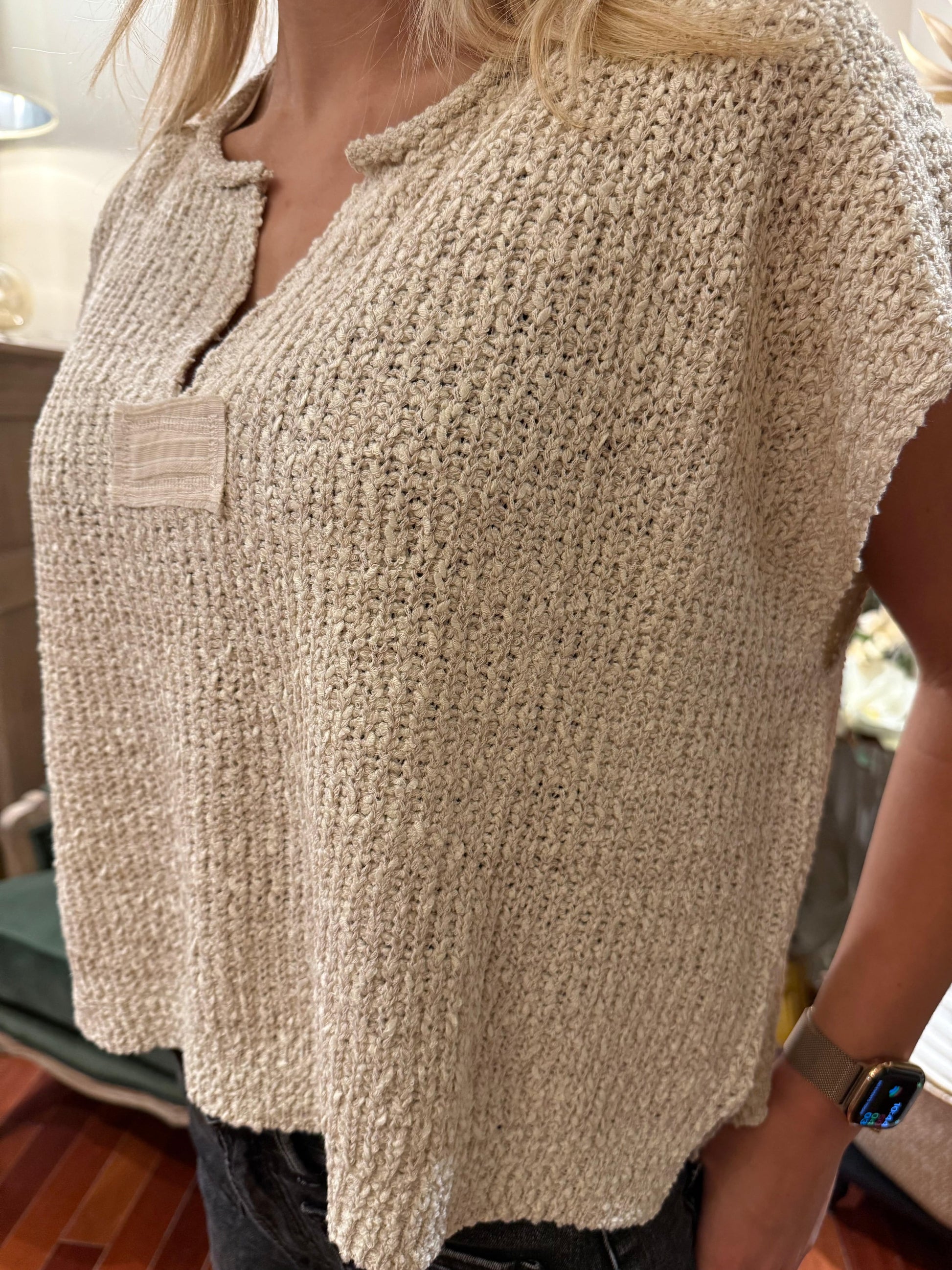 a loose fit, slouchy cropped sweater featuring V-neckline, cap sleeve, and solid front and back patch.