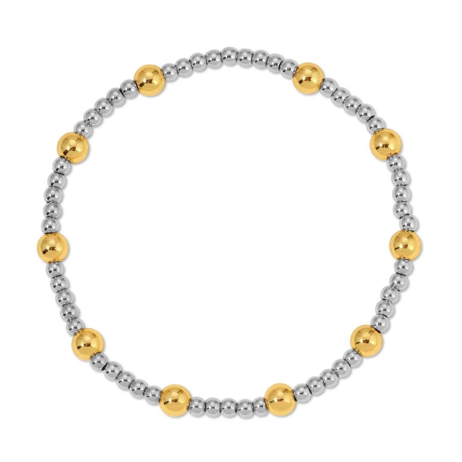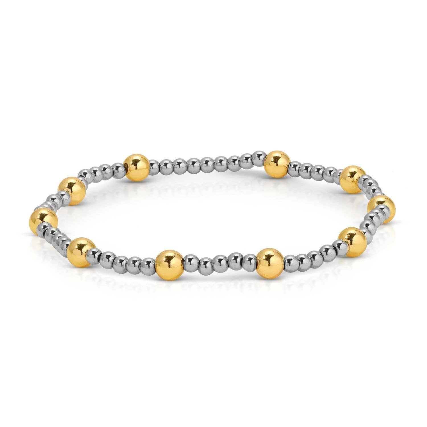 This bracelet is a must-have for its effortlessly cool style and comfortable wear. The two-tone beads create a lively display, perfectly accented by the 18K gold and rhodium plated brass beads for a sophisticated touch. Its stretch fit ensures comfort for all-day wear. This makes it an ideal jewelry gift for anyone who loves two-tone bracelets, stackable jewelry, or unique beaded accessories. Set/12 Stretch Bracelets 3mm and 5mm Beads 18k Gold and Rhodium Plated Brass Base