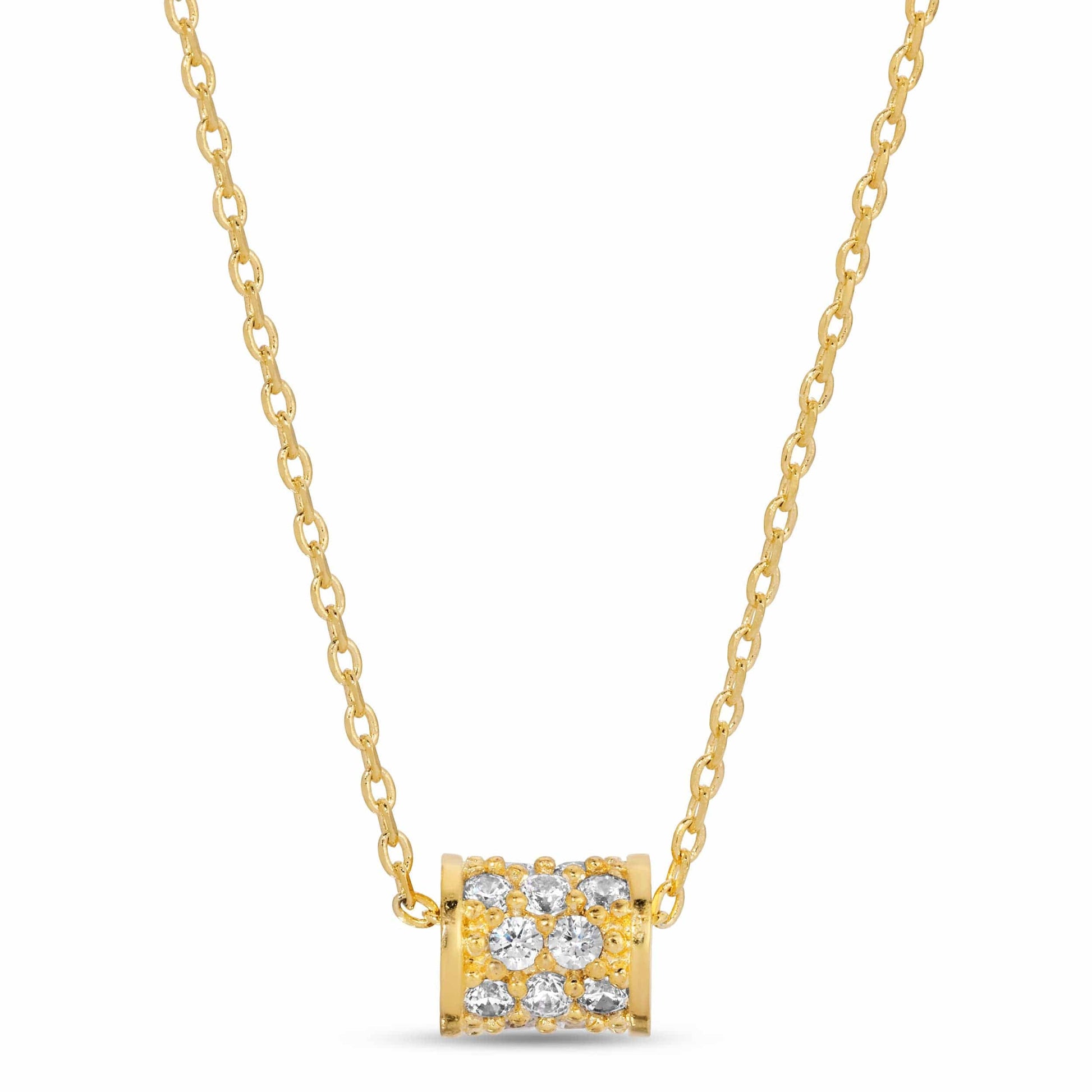 Elevate your look any time of day with this chic and sophisticated Pave Cylinder Pendant. Crafted with a timeless appeal, this delicate necklace is adorned with shimmering Cubic Zirconia. .2 x .25" Pendant 15.5" Necklace Plated Brass Cubic Zirconia